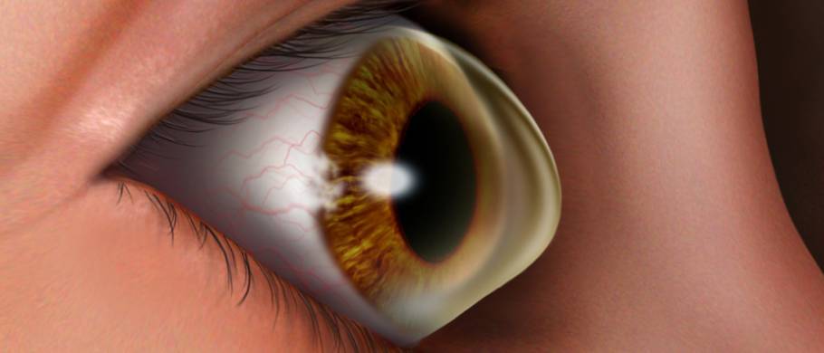 The cornea is the clear window at the front of the eye that covers the colored iris and the pupil. Light is focused while passing through the cornea to form a clear image on the retina. The healthy cornea is transparent. If the cornea is abnormal, damaged or diseased, it may become swollen or scarred, resulting in blurred vision or glare.